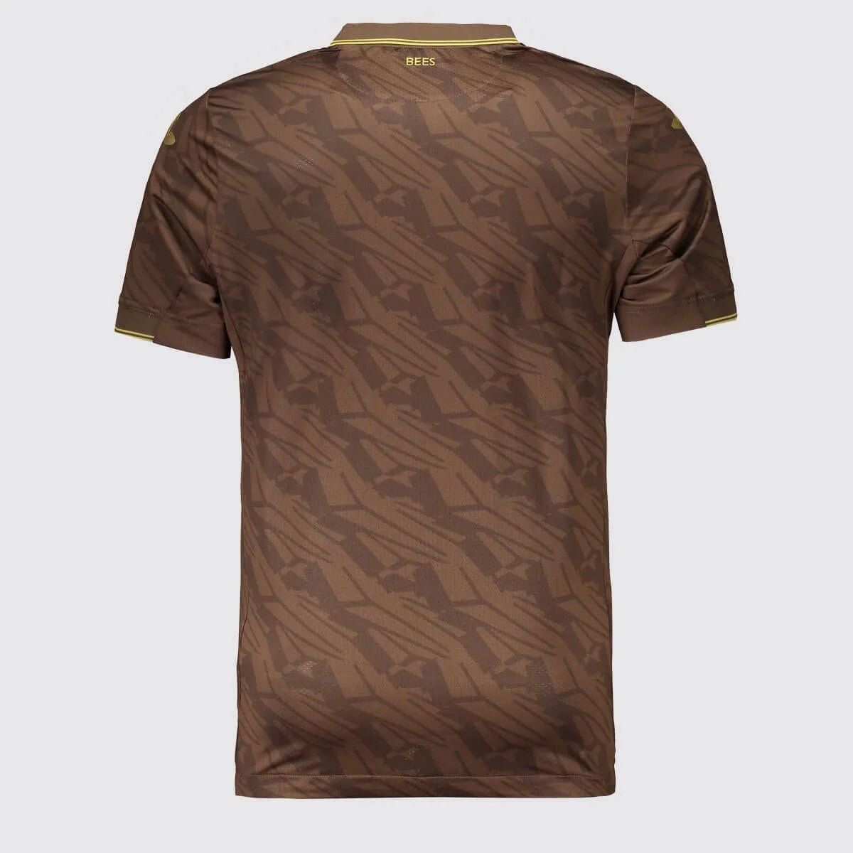 Short-sleeve shirt of Brentford FC’s second kit for the 2025/2026 season, men’s model. This first collaboration between Joma and Brentford FC features a second shirt in brown tones with gold details, highlighting a sublimated bee wing pattern that covers the entire garment, adding a sophisticated, distinctive style connected to the club’s historic identity.