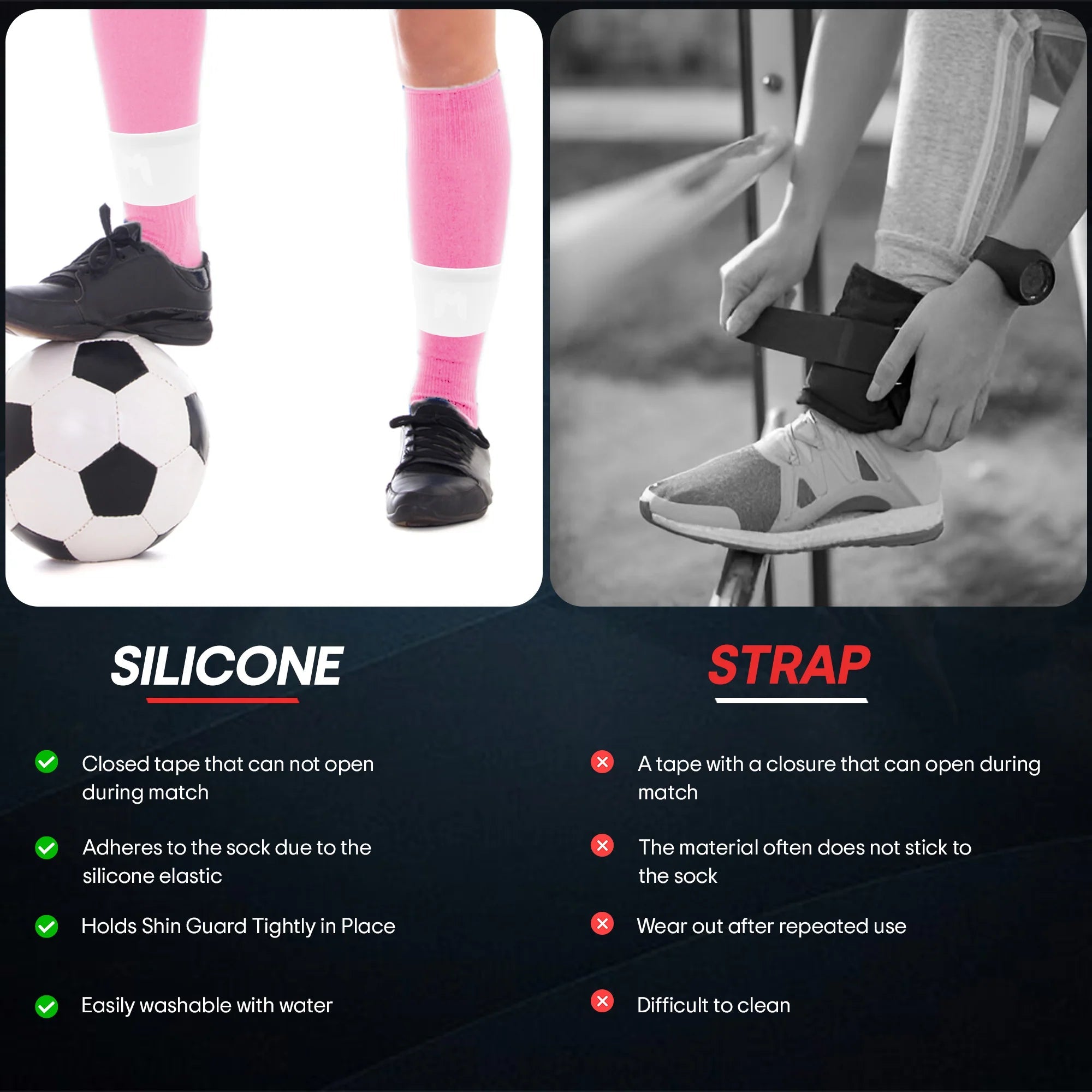 • Enhanced Grippy Straps to hold shin guards in place