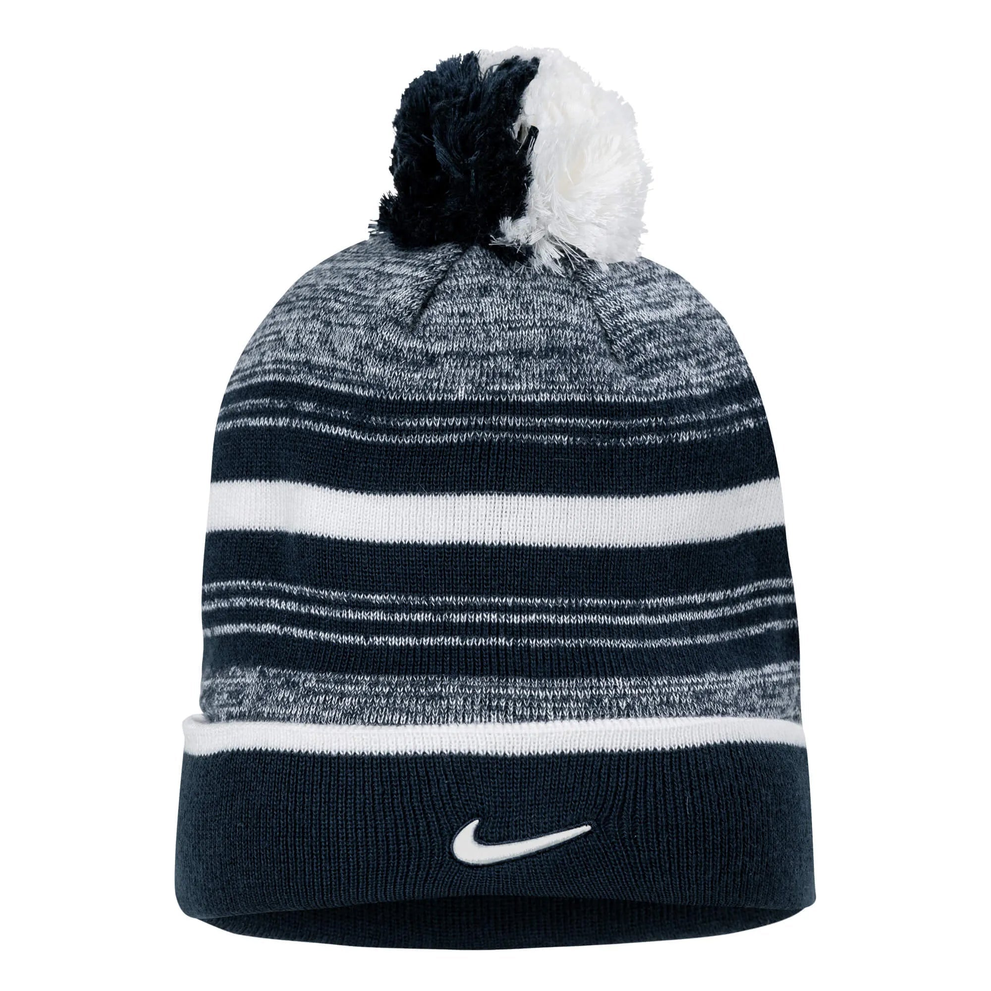 12″ knit beanie with cuff & pom. Jacquard stripes with embroidered team logo on center front cuff. Swoosh design trademark on center back.